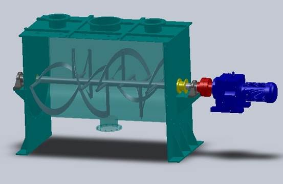卧式螺带混合机由安装于搅拌轴上的内外径螺旋带动桶体内物料,使搅拌器在桶体内较大范围翻动物料。搅拌器结构上,螺旋设计成内外、左右互为反螺旋,搅拌器工作时内螺旋带动靠近轴心处物料做轴心旋转,轴向由内至两侧推动,外螺旋带动靠近桶壁物料做轴心旋转,轴向由两侧至内推动,于是造成物料在桶体内对流循环、剪切渗混,完成物料在较短时间内快速均匀混合。